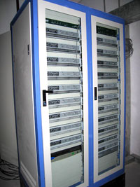 南京奥体中心体育场的音响系统的扬声器全部采用低阻抗电的方法,不采用升、降压变压器,因为除必须采用足够大截面的扬声器线外,分别在体育场东西看台设有两个功放室机房,将一部分功率放大器设在东看台机房,以减少扬声器线的长度、减少线路损耗,在体育场东西看台功放室机房用数字传输(东西看台功放室机房用光纤连接、音频线备份)加上系统中有数码处理器能对整个系统内每组扬声器工作状态进行智能控制和进行监测,使扩声系统的可靠性和灵活性得到保证。